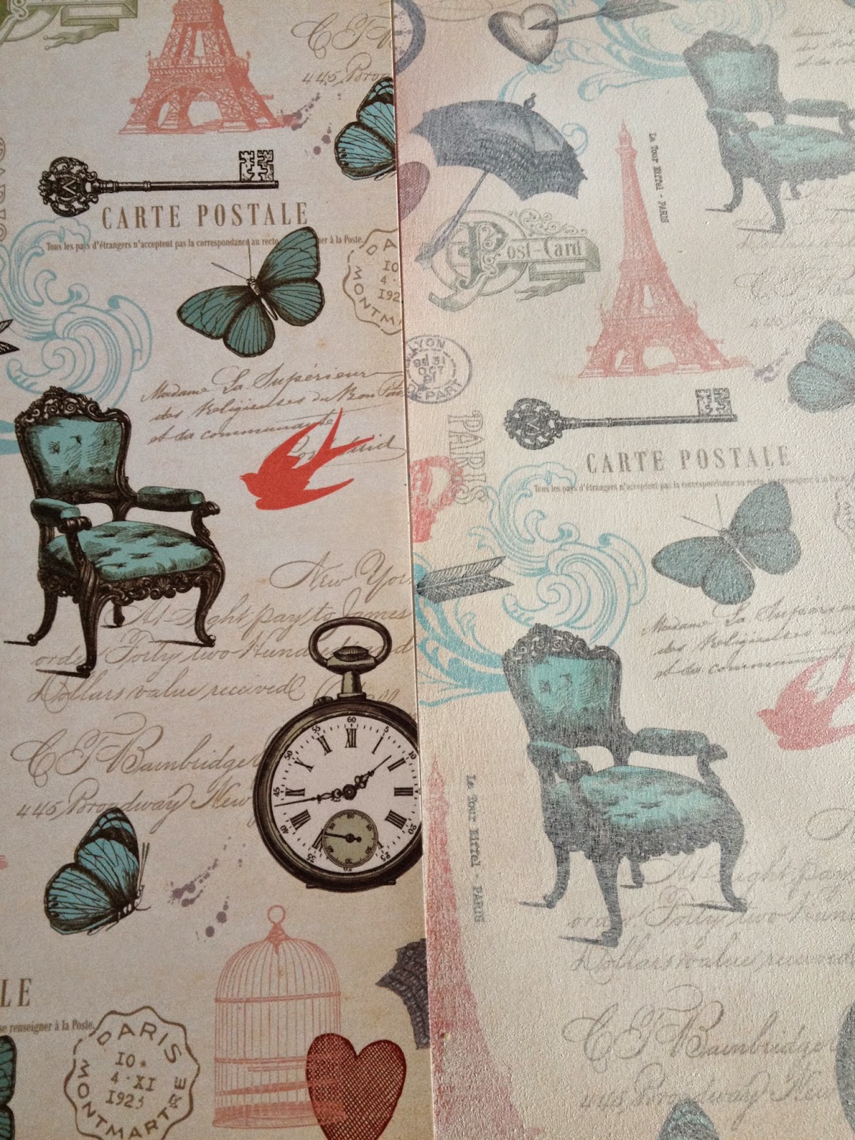 Step 1: Choose a background paper. Mine had vintage/Paris graphics on it which were quite prominent. Apply a thin layer of gesso using a roller/foam brush to get a fairly even application. Using a wet wipe (baby wipe) remove excess gesso from areas you want to highlight (On mine I removed gesso from the butterflies). Can you see the difference gesso creates?
